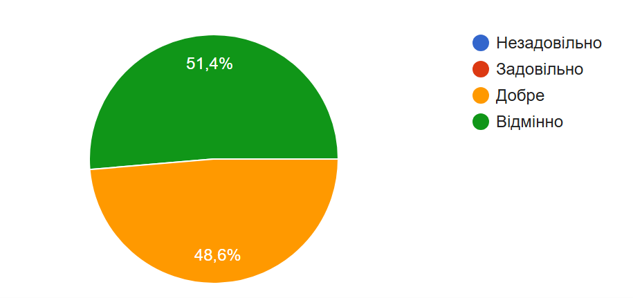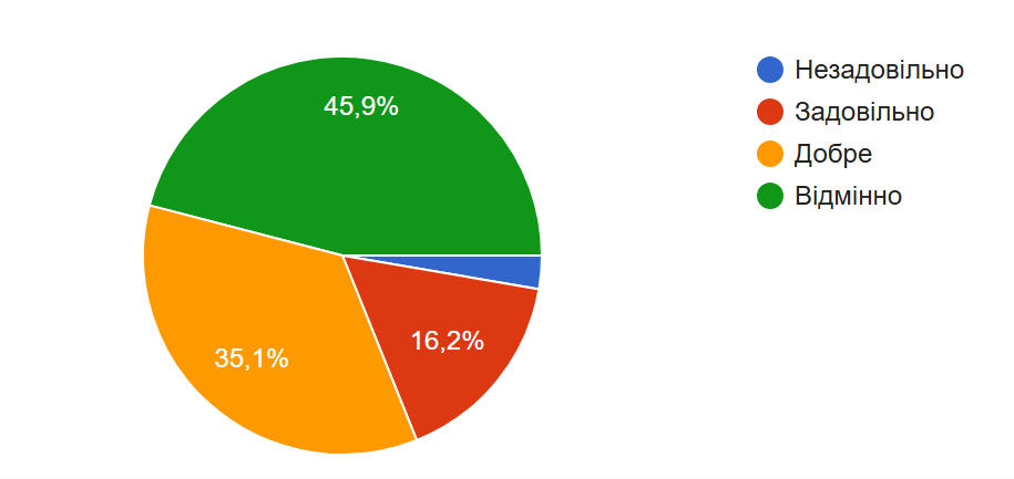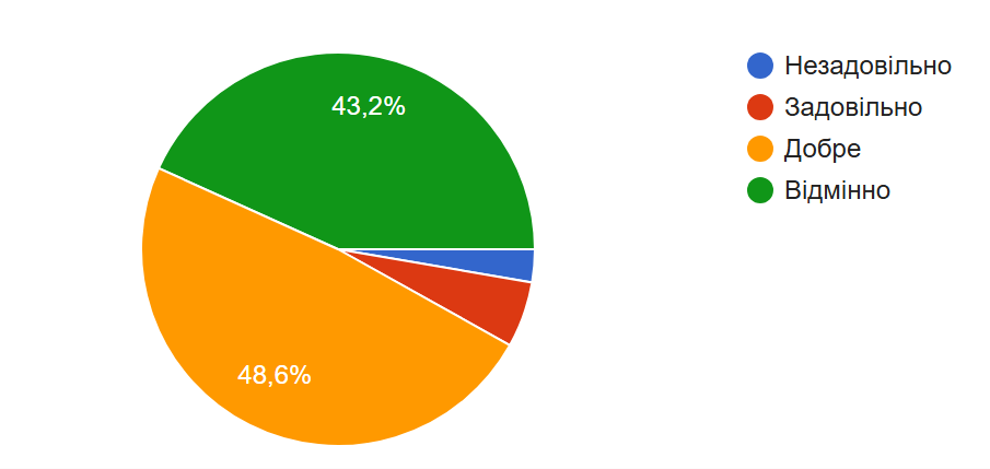 Опитуванням встановлено, що 18 респондентів при відповіді на поставлене запитання вказали на оцінку «добре» (48,6%); 16 респондентів – оцінку «відмінно» (43,2%); 2 особи (5,4%) – «задовільно»; одна особа (2,7%) – «незадовільно».
