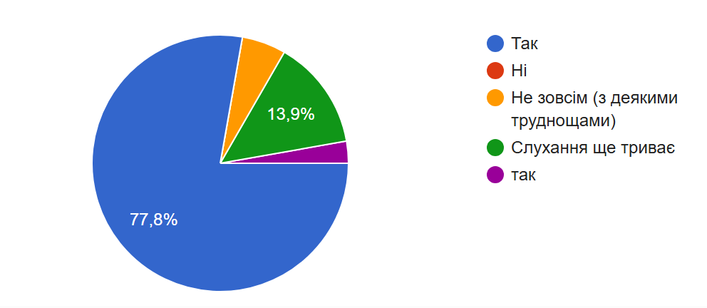 Для більшості респондентів (29 осіб – 80,6%) рішення було викладено легкою, доступною для розуміння мовою; 5 опитуваних зазначили, що розгляд справи ще триває (13,9%); 2 особи визнали рішення не зовсім зрозумілим (5,6%) та один відвідувач утримався від відповіді на запитання.
