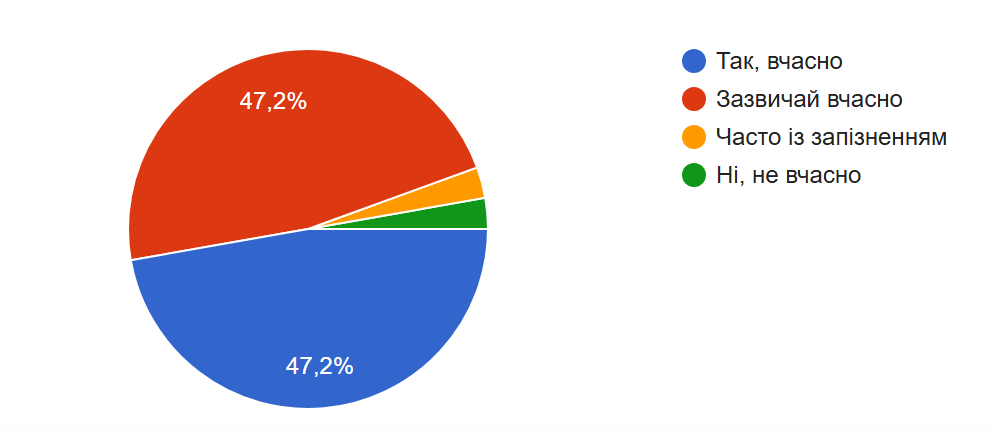 На вчасність отримання документів вказали 17 респондентів (47,2%), зазвичай вчасно отримували документи так само 17 осіб (47,2%), частіше із запізненням – одна особа (2,8%), не вчасно – теж одна особа (2,8%), одна особа не відповіла на запитання.
