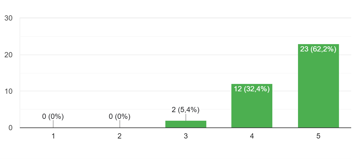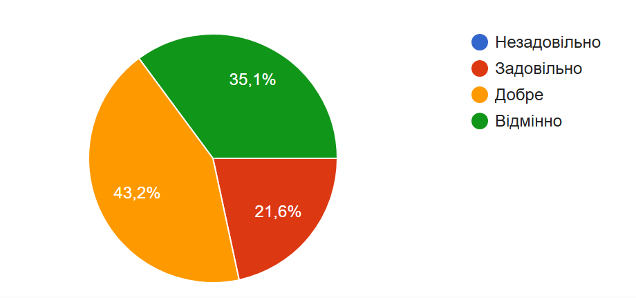16 опитаних осіб вказали на оцінку «добре» (43,2%), 13 осіб – на оцінку «відмінно» (35,1%), 8 осіб – на оцінку «задовільно» (21,6%), жодна особа не вказала на незадовільні умови.