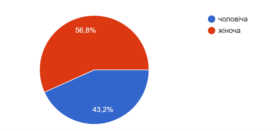 В опитуванні взяли участь 21 особа жіночої статі (56,8%) та 16 осіб чоловічої статі (43,2%).