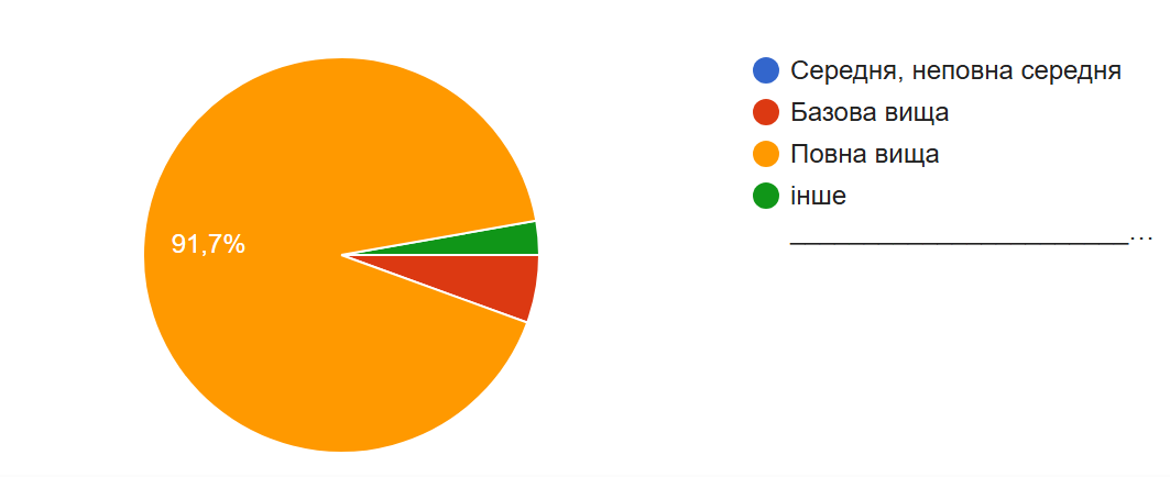 Опитування показало, що 33 особи мають повну вищу освіту (91,7%); 2 особи мають базову вищу освіту (5,6%); одна особа має дві вищі освіти (2,8%) та одна особа не відповіла на запитання.