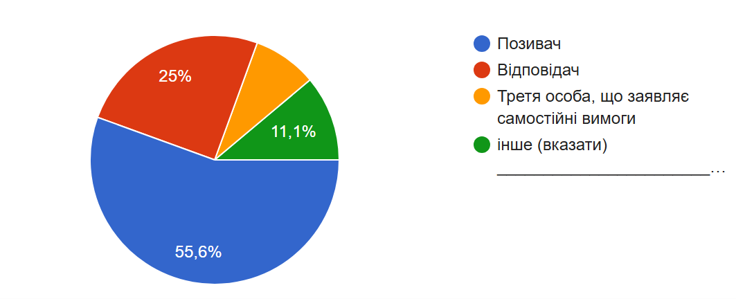 Більше всього в опитуванні взяли участь респонденти, які прийшли до судових засідань у статусі позивача – 20 осіб (55,6%); 9 осіб – в статусі відповідача (25%); категорія «інше» – 4 особи (11,1%); 3 особи в статусі третьої особи, що заявляє самостійні вимоги (8,3%); і одна особа не визначилась із своїм статусом.